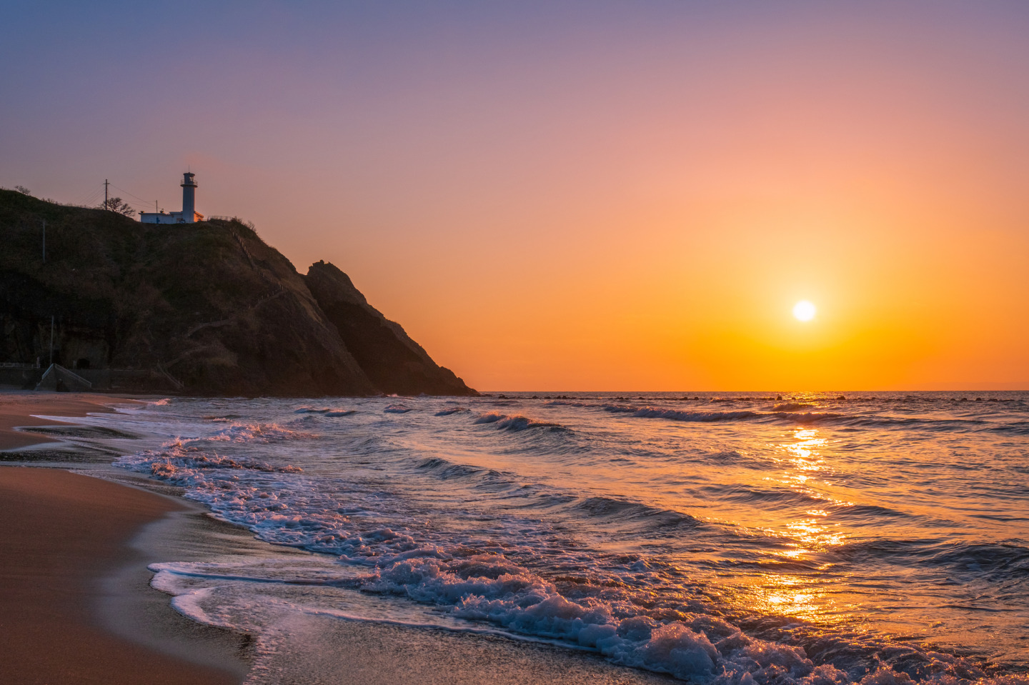 旅の締めくくり!真っ白な灯台と日本海に沈む夕日の絶景