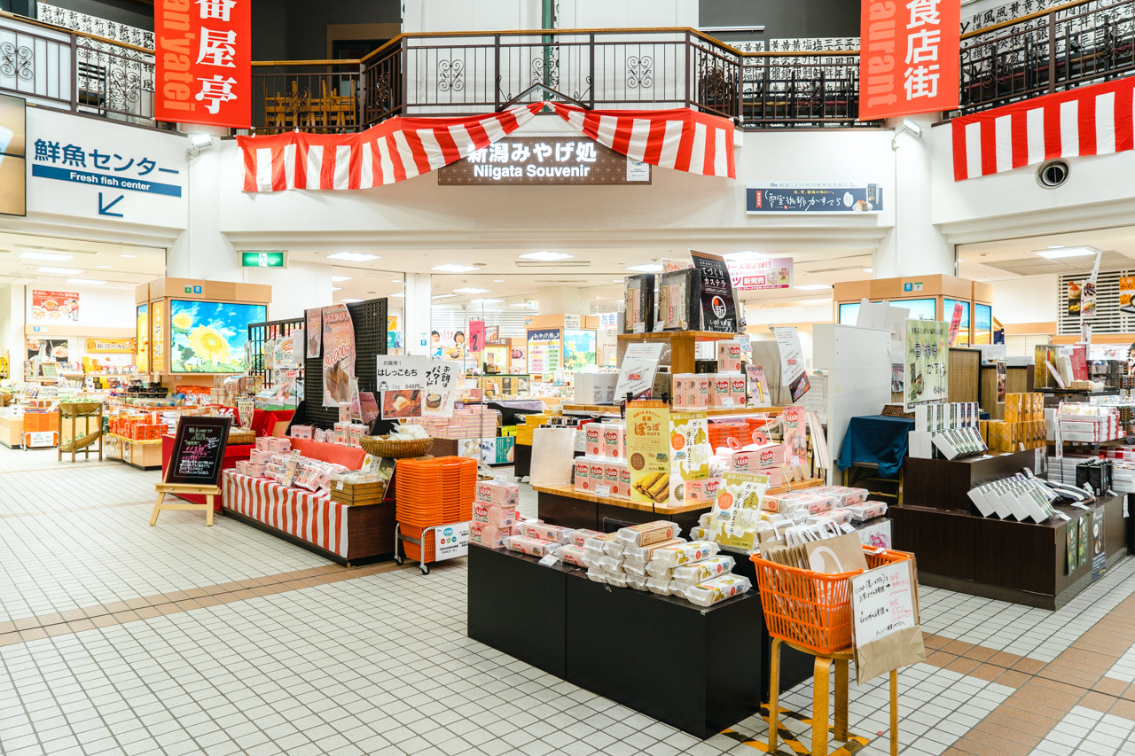 県内最大規模の道の駅「新潟ふるさと村」。「バザール館」では、県内各地の地酒や米、銘菓や名品などを購入できます。新潟のブランド米、新之助など個包装の商品もありお土産に最適です。
