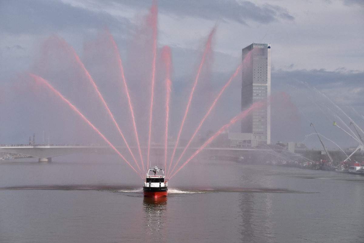信濃川両岸から消防車両と消防艇による一斉放水を行います。