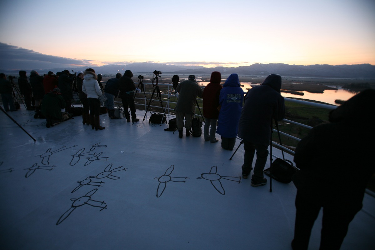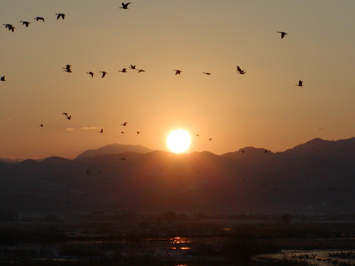 オオヒシクイ(雁の仲間)の日本一の越冬地「福島潟」。展望施設「ビュー福島潟」屋上から、初日の出・初雁を見よう。元旦は、6時30分から12時30分まで特別開館します。
