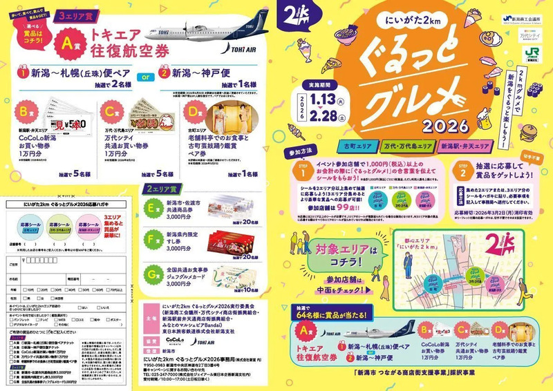 期間中に3つのエリアの飲食店を楽しみながら巡り、応募シールを集めると豪華賞品が当たるキャンペーンに応募できます!「トキエア往復航空券『新潟~札幌(丘珠)便』または『新潟~神戸便』」や「料亭お食事&芸妓鑑賞ペア券」、「CoCoLo新潟お買物券」、「万代シテイ共通お買い物券」等の賞品を目指してぜひご応募ください!※各参加店舗のシールは予定配布枚数に達した時点で終了となります。