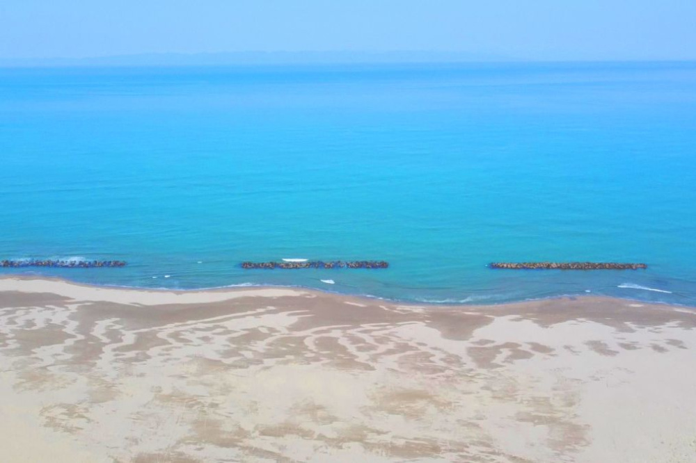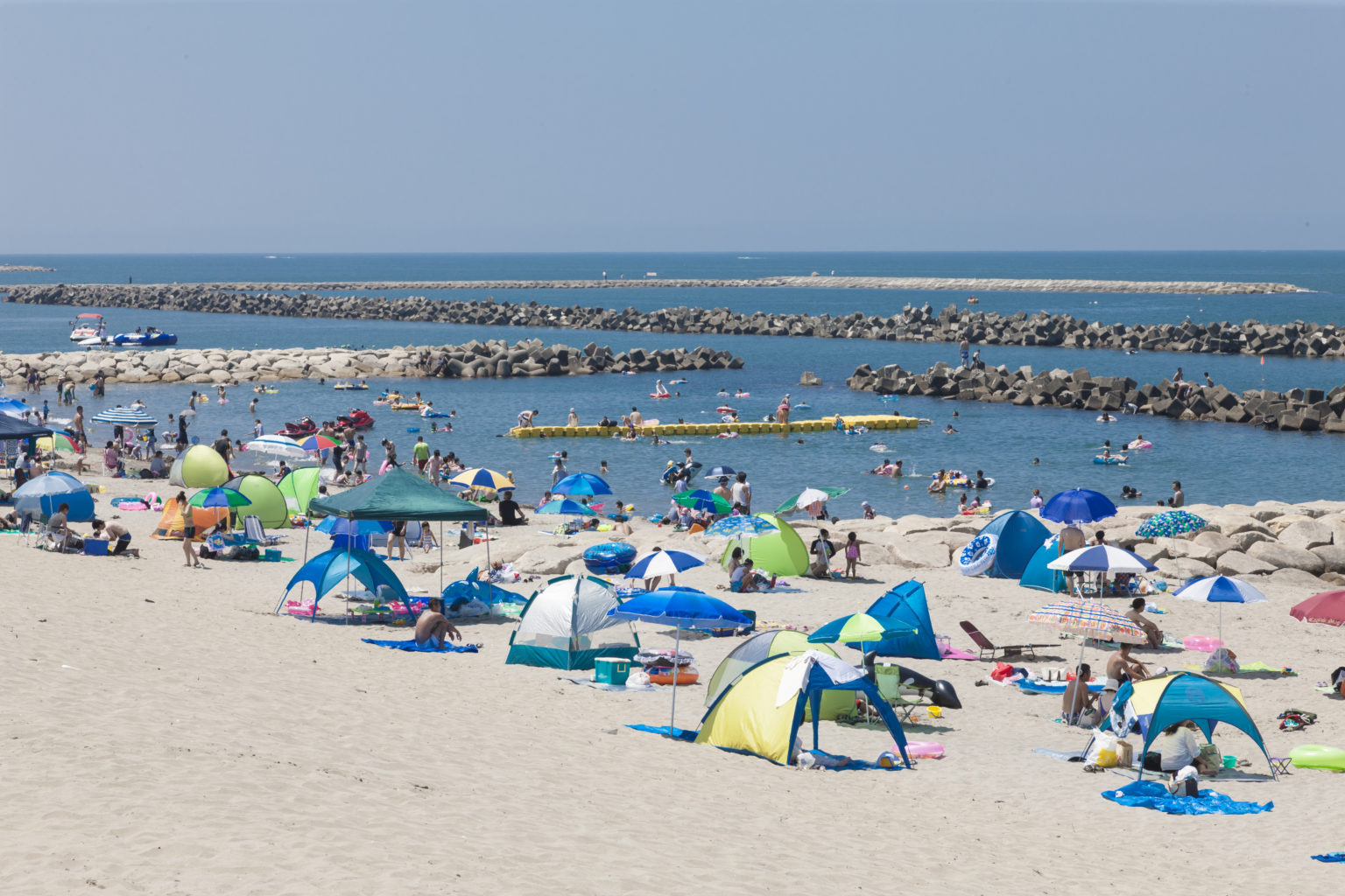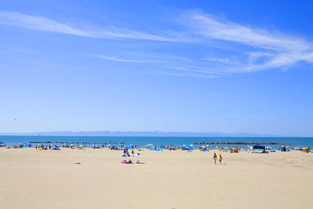 遠浅の砂浜で、離岸堤や突堤に囲まれている海水浴場です。