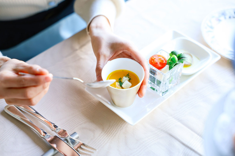ベルビューのアフタヌーンティーは、アミューズからスタート。スープや地元野菜を使ったバーニャカウダなどを楽しめます。