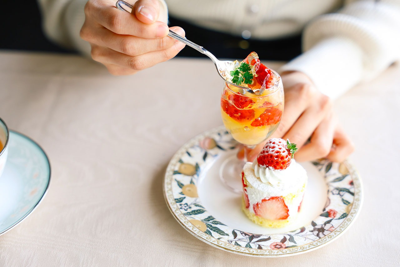地元新潟の食材を取り入れているのも魅力の一つ。この日のスイーツには新潟のブランドいちご「越後姫」を使用。いちごの甘味と香りを味わえるケーキやゼリーなど春を感じさせる華やかな見た目が印象的です。