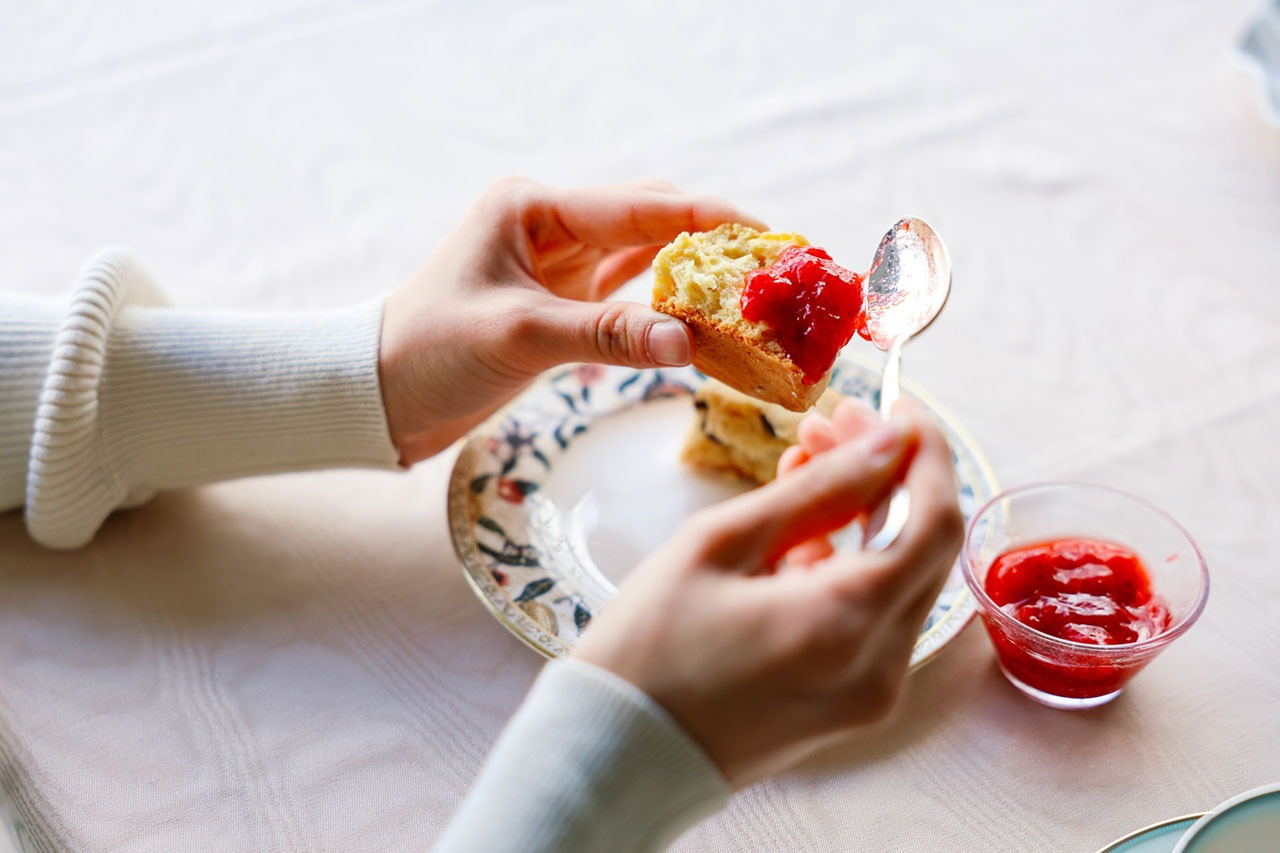 おすすめは、外はサクッと中はしっとりとした食感のスコーン。香り豊かな「越後姫」のコンフィチュールをつけていただきます。
