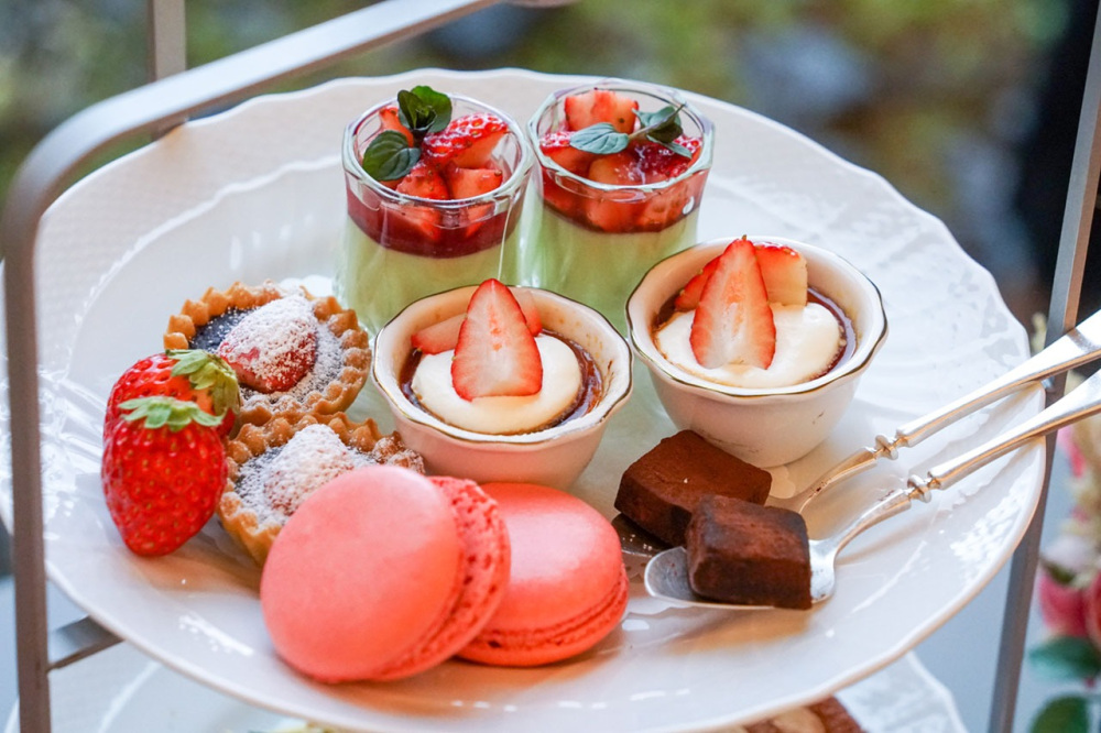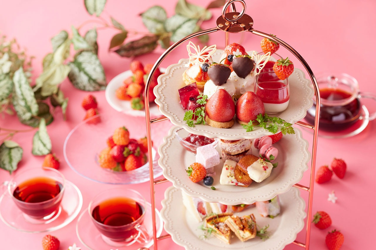 マルコポーロのアフタヌーンティーは、季節ごとに変わります。春は「越後姫」を贅沢に使用。「越後姫のタルト」や「苺のひとくちショートケーキ」、「苺のムース」など9種のスイーツと3種のセイボリーを楽しめます。装飾の華やかさも人気の理由。