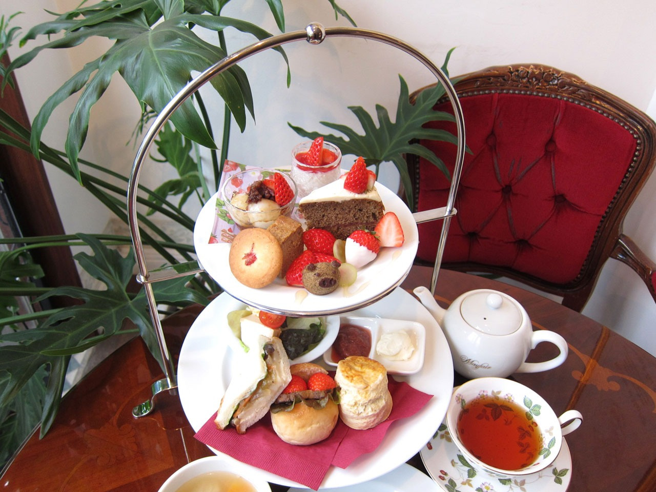 メイフェアでは、食事系アフタヌーンティーの「季節のアフタヌーンティー」と、スイーツ系アフタヌーンティーの「デザートアフタヌーンティー」の2種類を注文可能。予約がいらないのは嬉しいポイントです。名物の「スコーン」は、上質なバターを贅沢に使った丁寧な手作り。外はサクサク、中はしっとりした食感を楽しめます。クロテッドクリームと自家製ジャムを乗せていただきます。