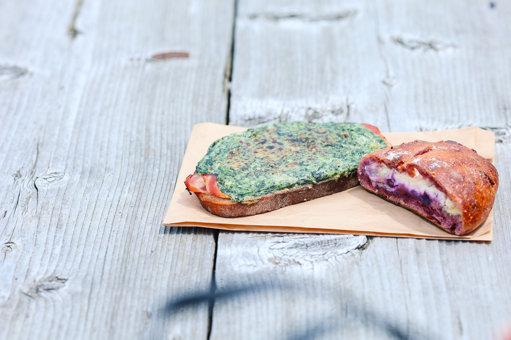 購入したパンは2つ。人気のほうれん草のタルティーヌは、薄切りのハードパンと上にのったほうれん草ペーストとベーコンが相性抜群。ブルーベリーのパンは、ブルーベリーの甘酸っぱさとクリームチーズの甘味、パンの素朴な味わいが絶妙です。朝の海を眺めながら食べるパンは格別です。