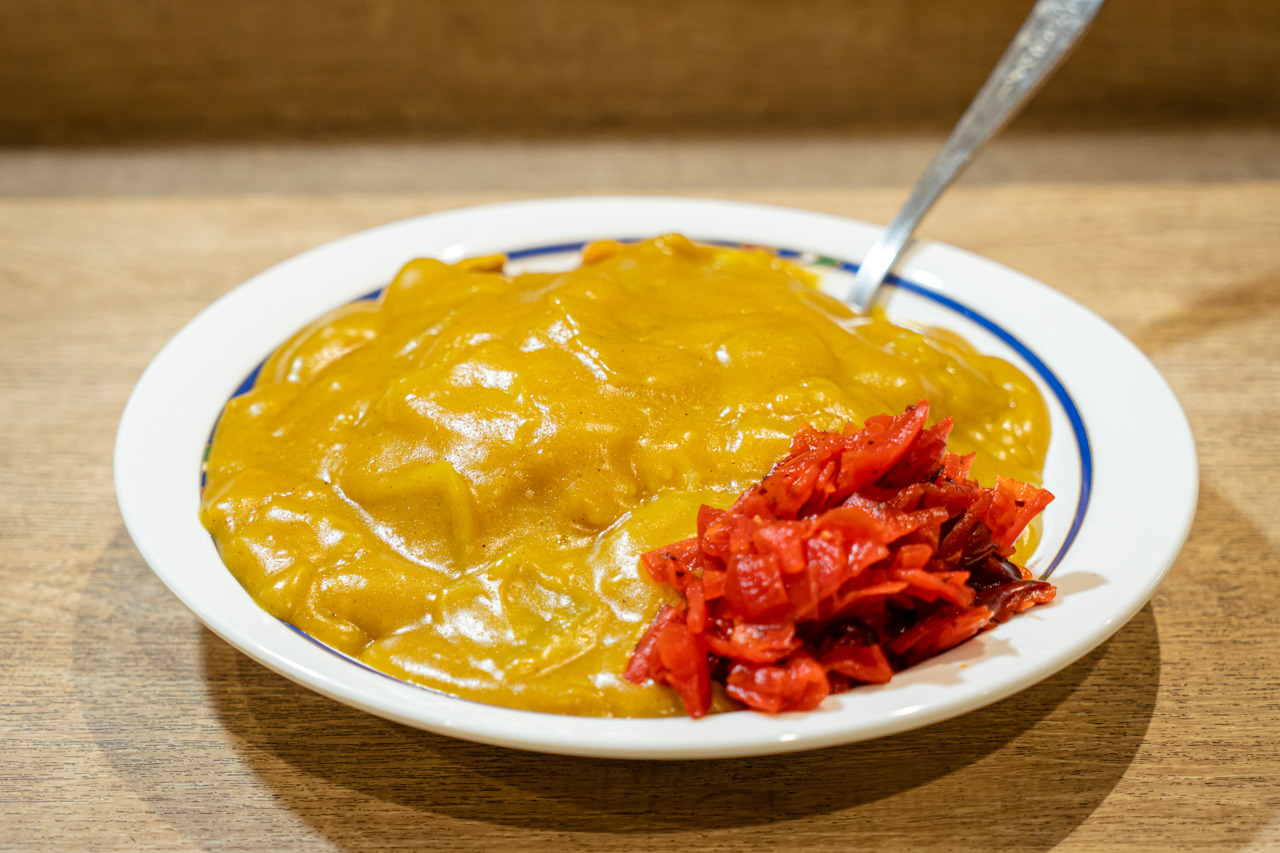 懐かしい黄色いルーが人気の理由。ピリッと辛く、スパイスの風味が香るルーには、トンコツスープをベースに、玉ねぎ、にんじん、新潟県産の豚肉を使っています。カレー用にブレンドされた県産米と相性抜群。サイズは、ミニ、普通、大盛りの3種類から選べます。創業当時から変わらない味を堪能してみてください。