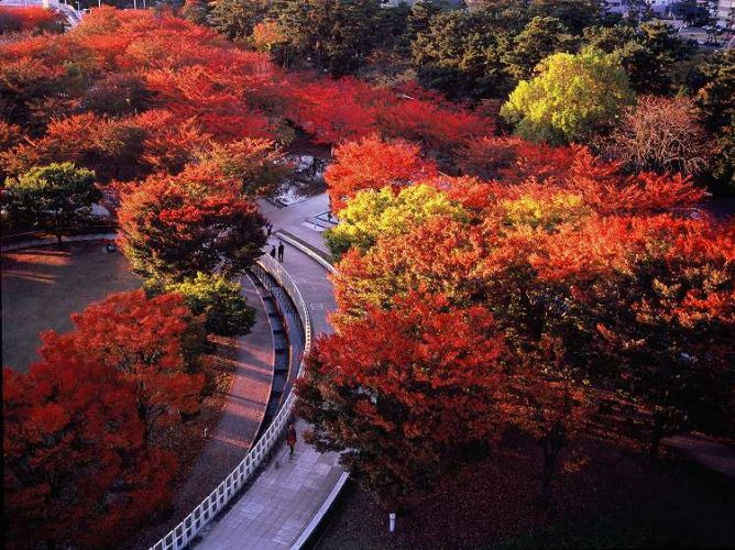 日本で最初の公園の一つで、池、築山、花木を配したオランダ風の回遊式庭園。「縁結びの白山さま」として有名な、新潟総鎮守白山神社に隣接しています。また、 白山公園(白山神社)から繋がる白山公園空中庭園は、6つの空中庭園と水路や池、滝などがある公園です。紅葉期には、桜の木が紅く色づきます。庭園内にある新潟市民芸術文化会館・りゅーとぴあ 屋上庭園からは、公園の紅葉を一望できます。