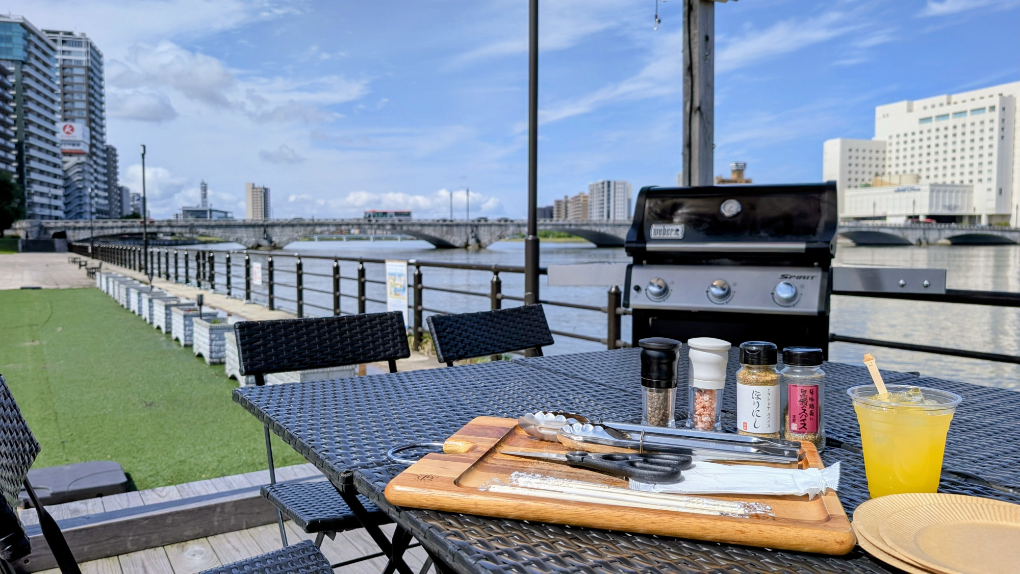 新潟市の街中を流れる信濃川沿いの堤防やすらぎ堤には、BBQを楽しめる場所が2つあります。「万代テラス ハジマリヒロバ」は、河口部分にある万代島でバーベキューを楽しめる人気のスポット。開放的なテラスからは国指定重要文化財萬代橋や街の景色を眺めることができます。
