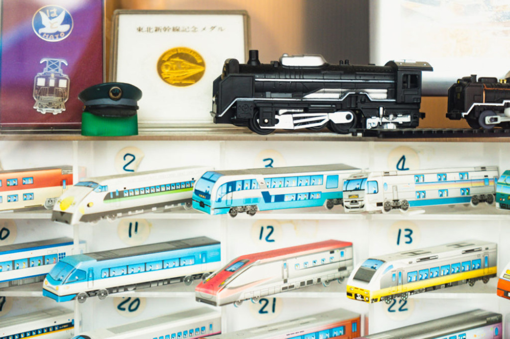 ショーウインドウに飾られたC57や電車の関連グッズが迎えてくれます。