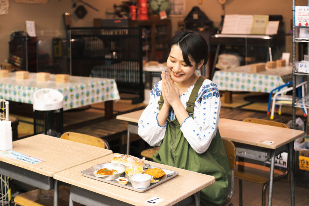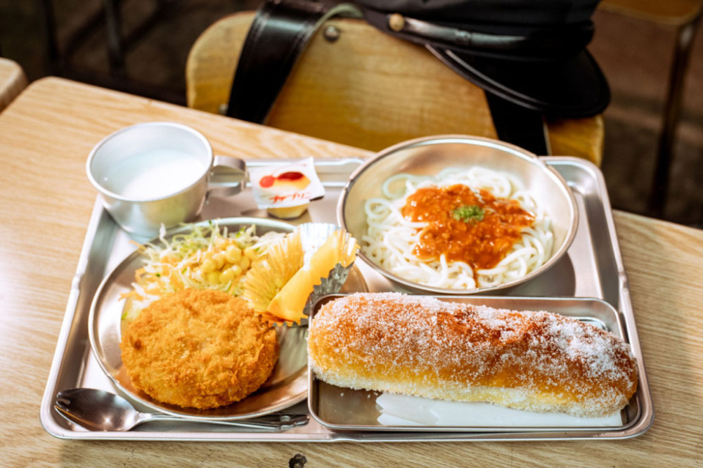 昭和40年代の給食が再現された「昭和の学校給食セット」は、揚げパン、ソフト麺、ハムカツ、牛乳にデザートがついて650円。