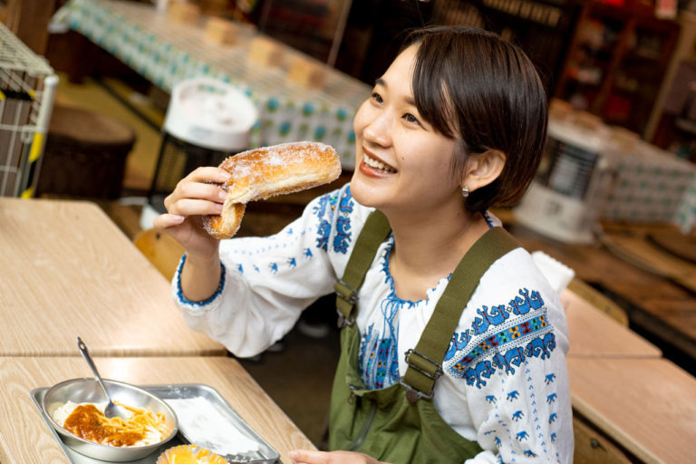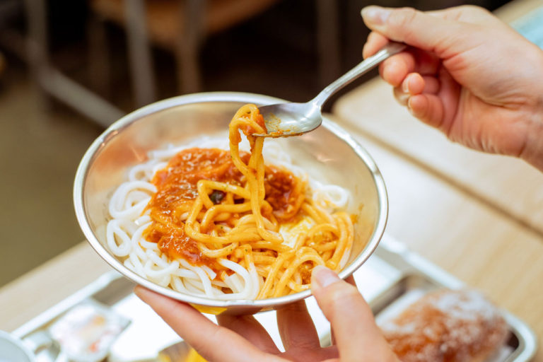 ミートソースが絡んだソフト麺は、先割れスプーンを使って。揚げたての揚げパンは砂糖、きな粉、ココアから選べます。一部のメニューは、持ち帰りもできるのでお土産にもピッタリ。