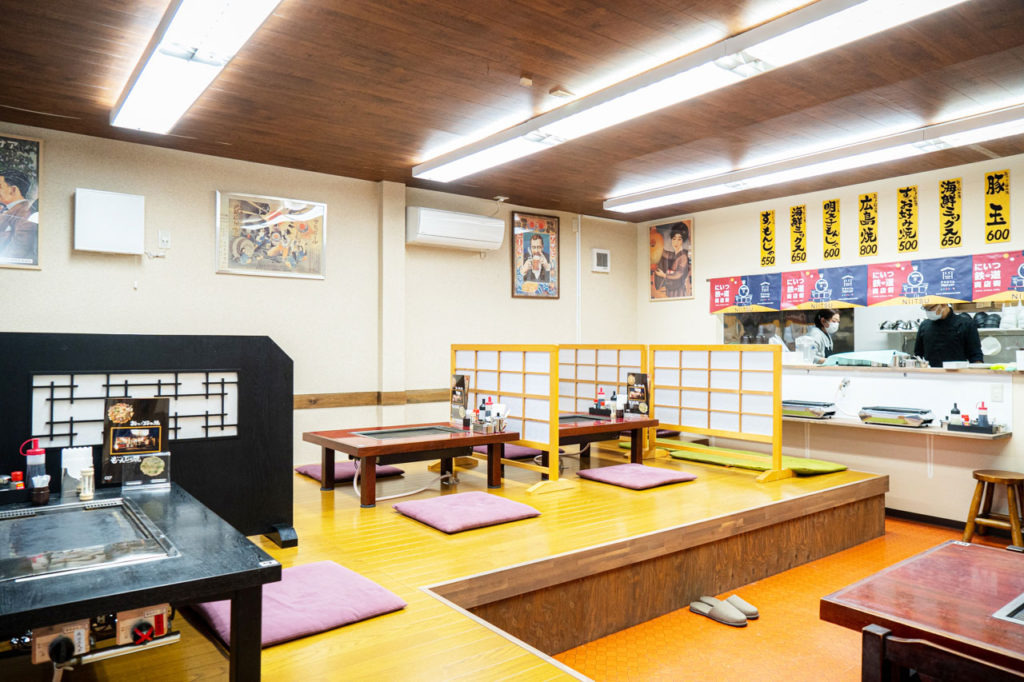 懐かしい歌謡曲が流れる店内。テーブルや座敷、1人用のカウンター席では、ゆっくりとお好み焼きやもんじゃ焼き、広島焼きをいただけます。