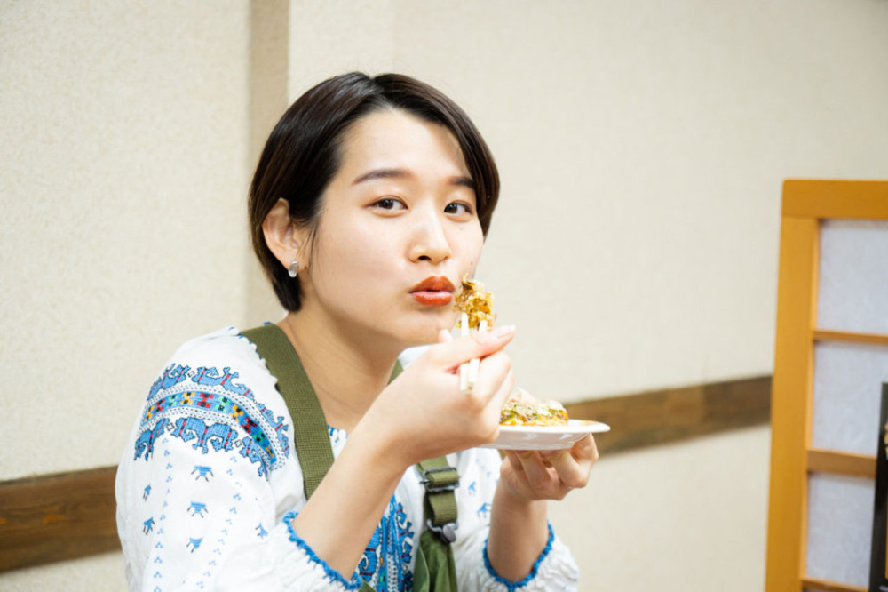 すべてのメニューが昆布と鰹だしを使った関西風。昆布だしを使うことでまろやかな風味になるそう。お好み焼きは、軽い口当たりで、大きめに切ったキャベツの歯ごたえがアクセントになっています。チーズやキムチ(各100円)などをトッピングして自分だけの味を作ってみてくださいね。