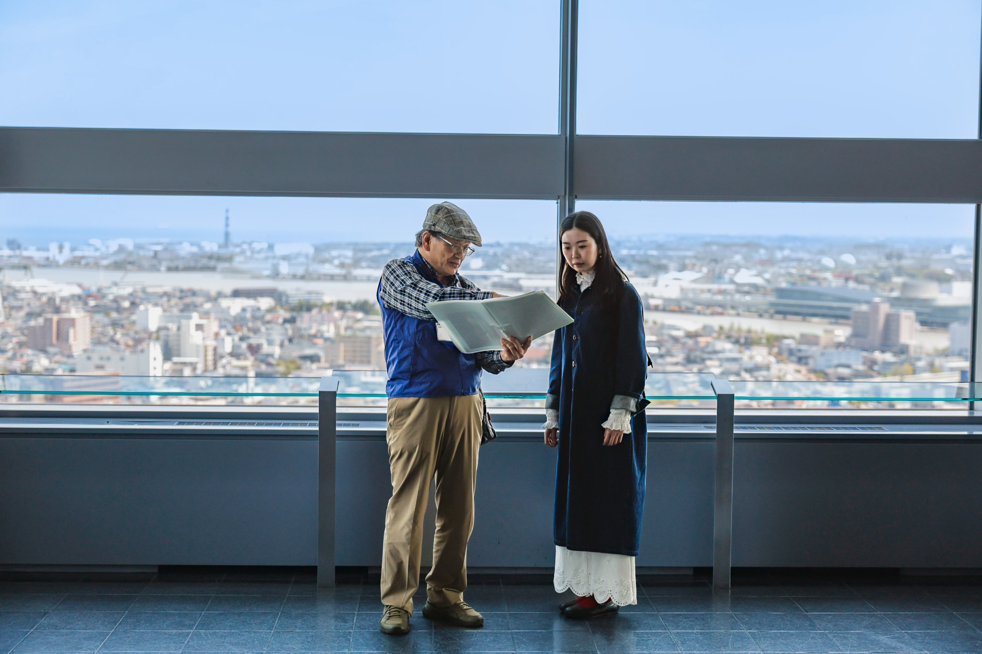 早速NEXT21の最上階にある展望室へ。地上101mから市内を一望できる人気の場所です。まずは街並みを眺めながら、古町の歴史を教えてもらいます。