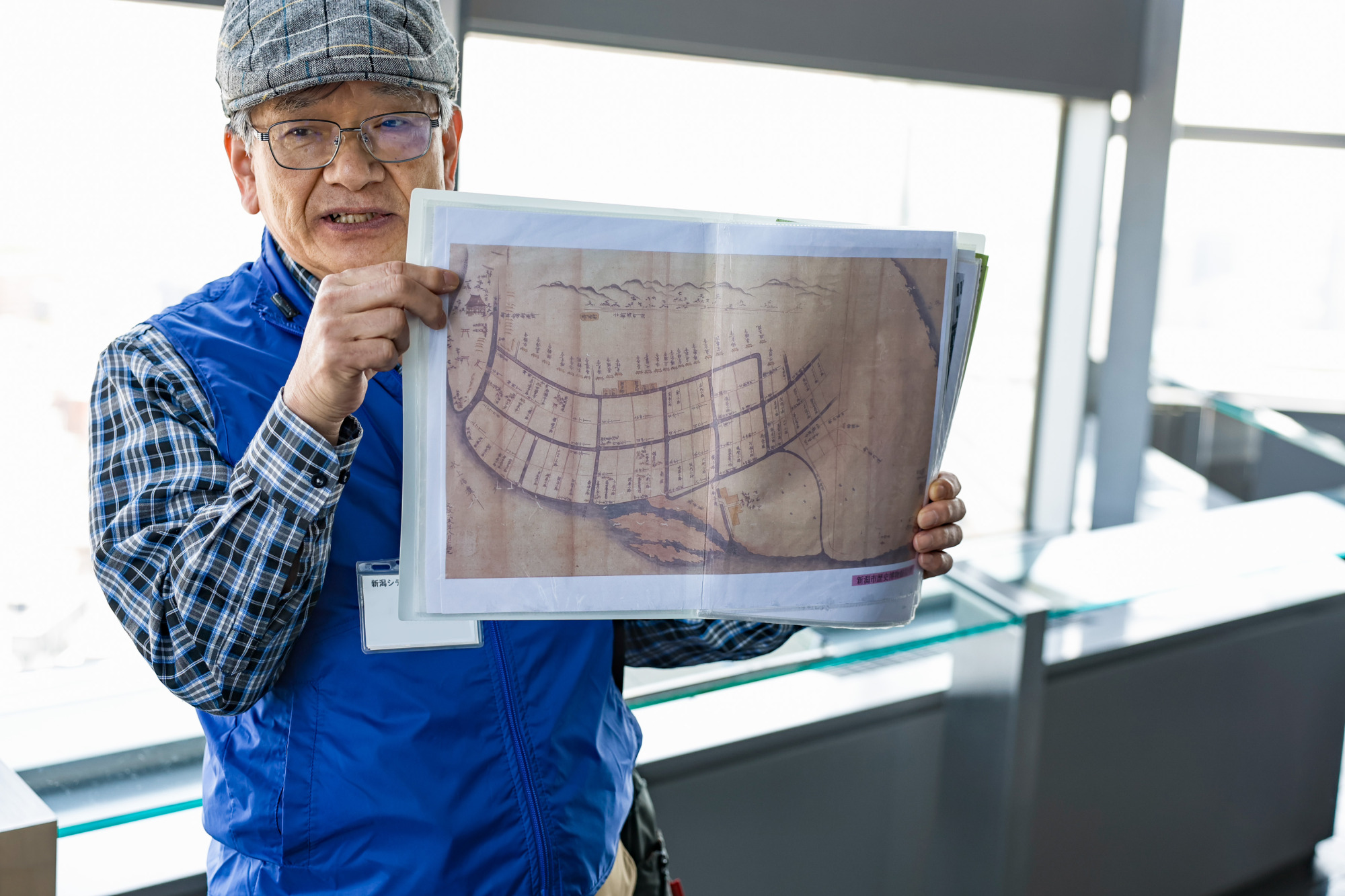 「古町は海と信濃川に囲まれた新潟島と呼ばれるエリアにあります。1655年、長岡藩により街並みが整備され、古町には奉行所が建てられました。私たちのいる西堀沿いには、約30のお寺が建てられ現在も一直線に並んでいます。」と江戸時代の古地図を持って説明する倉地さん。当時と比べると近代的になりましたが、現在までまちの形は変わっていないそう。