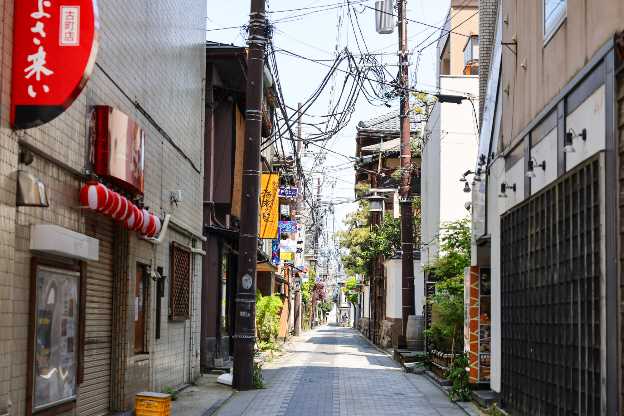 通りや小路が多い古町。花街にも多くの小路があります。待合だった「旧美や古」や置き屋などが並ぶ六軒小路もその一つ。歴史ある建物が残る場所です。歩いていると三味線や踊りの練習をする音が聞こえる時も。通りには置き屋を改装した飲食店もあります。