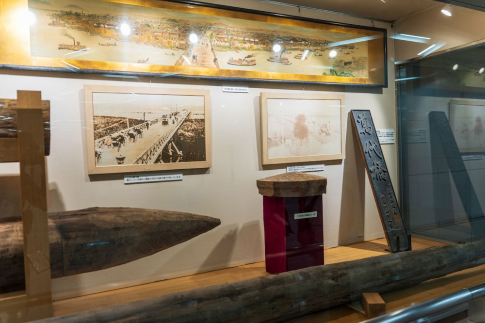 次に訪れたのは地下通路「万代クロッシング」。こちらには、初代萬代橋に使われていた杭や、橋の模型などが展示されているスペースがあります。