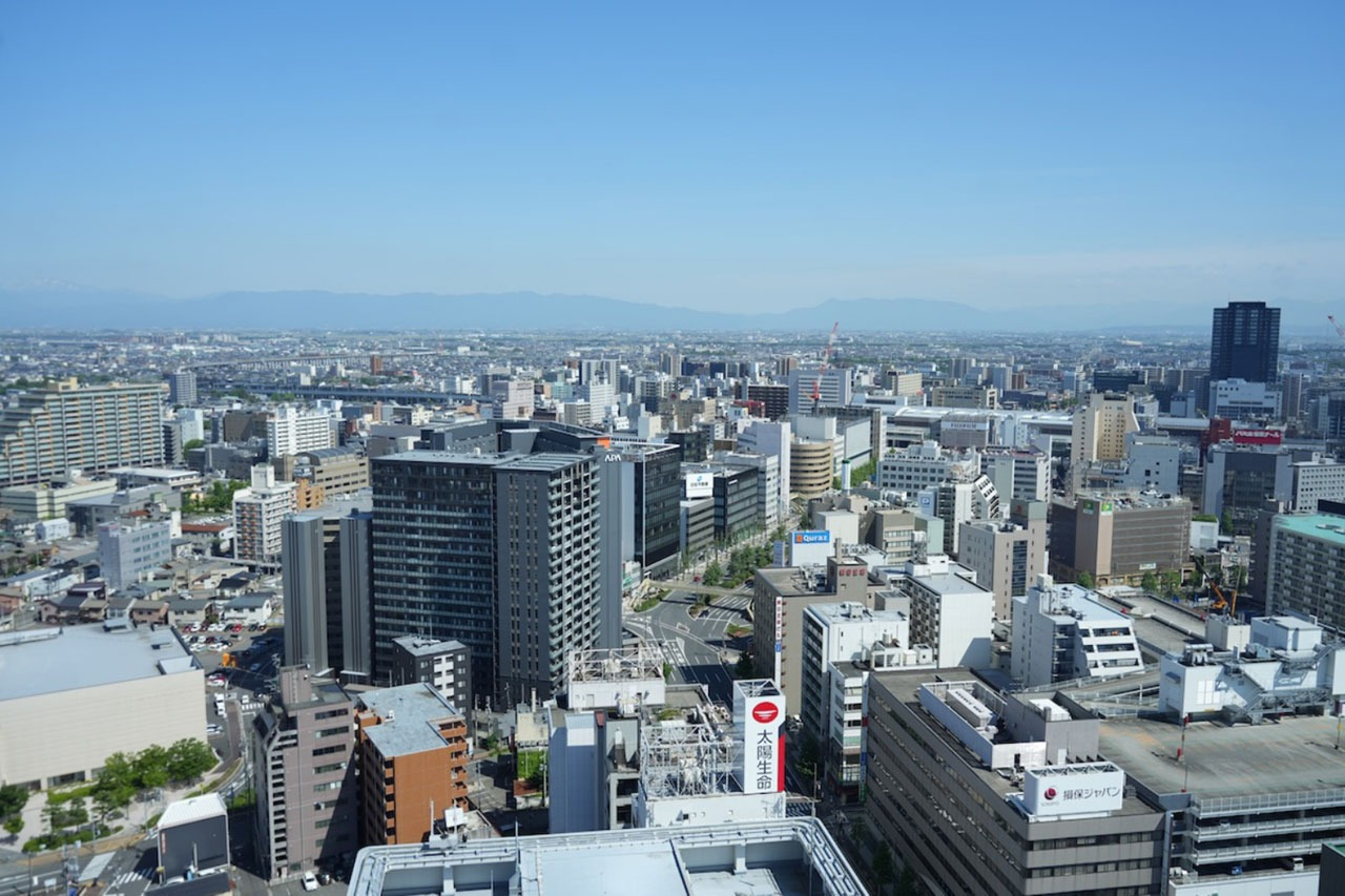 北側展望エリアのすぐ真下には、新潟市のシンボル、萬代橋の姿が。その先には、新潟市の中心繁華街「古町」エリアが広がっています。