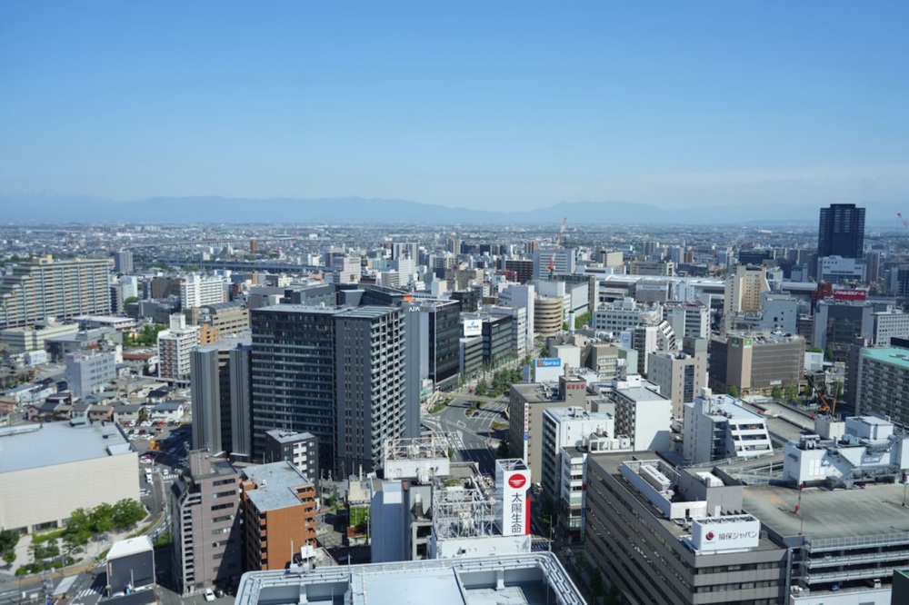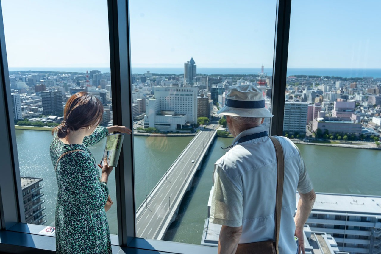 万代クロッシングを通って渡辺さんが連れてきてくれたのは新潟日報メディアシップ最上部にある「そらの広場」。地上100mにある展望室で、新潟市中心部屈指のビュースポットです。東西南北360度のパノラマ眺望を楽しめます。観光スポットとしても人気ですが、まち歩きの際にもとても便利。先ほど歩いてきた新潟駅前〜流作場五差路(写真中央右)も一望できます。