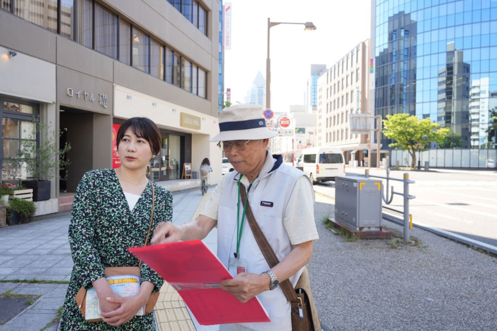 「新潟シティガイド」は、新潟市が主催する「みなとまち新潟観光ボランティアガイド養成講座」を受講した市民によるグループです。新潟市の魅力を伝えるために、名所やおすすめスポットを一緒に歩きながら、詳しく案内してくれます。今回案内してくださったのは、新潟シティガイドの渡辺さん。ガイド養成講座1期生で、新潟シティガイドの発足当初から案内をおこなってきたベテランガイドです。