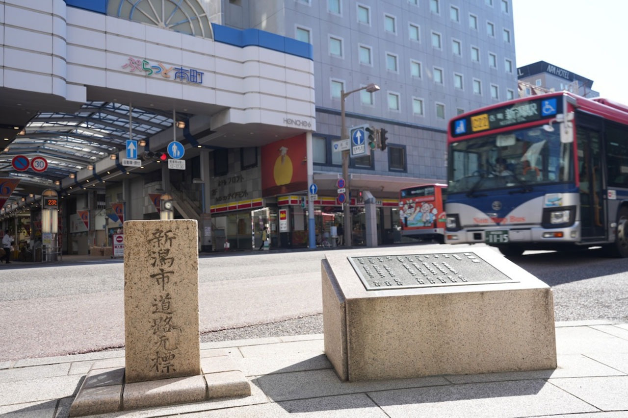 渡辺さんが「新潟ならでは」のスポットとしておすすめするポイント「本町交差点」。すぐそばには「新潟市道路元標」と書かれた石碑があります。こちらの交差点には、国道7・8・17号線のほか、多くの道路の始点・終点が集まっており、これだけの数の起終点が集中している場所は全国的にみても珍しいのだそうです。