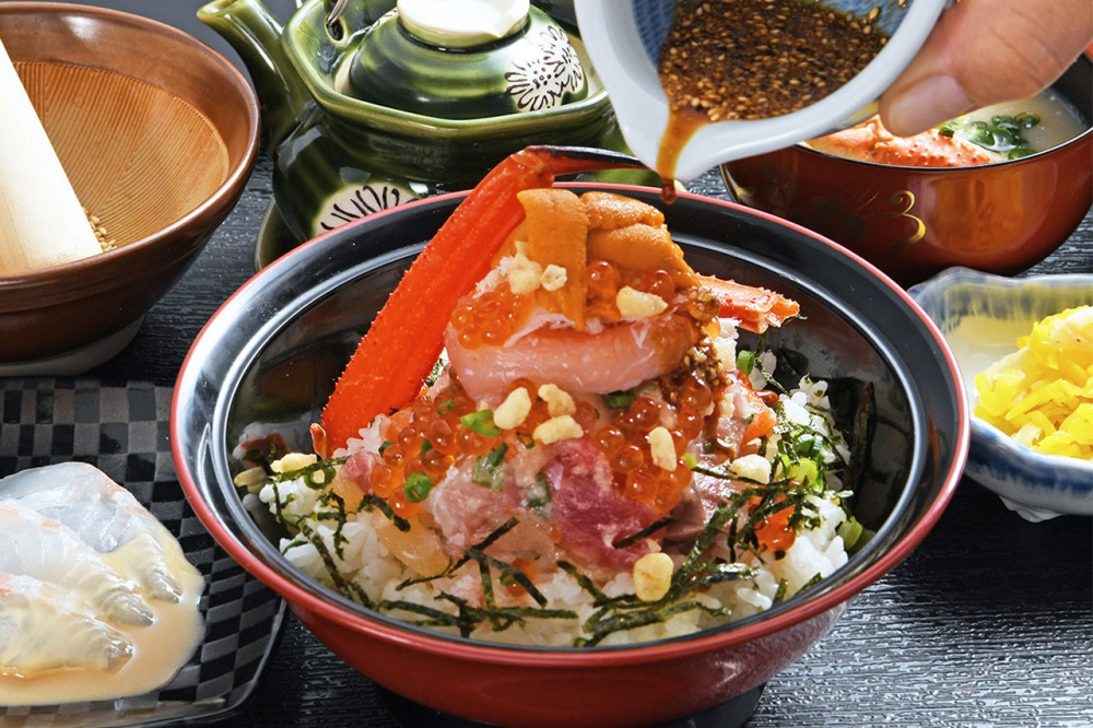「極上海鮮 特上越佐丼」は、うに、いくら、ずわい蟹、銀さけ、まぐろ、ぶりなど新鮮なネタを盛り込んだ食べ応えのある海鮮丼です。最後はごまダレが絡んだ刺身に鯛だしをかけて鯛茶漬け風にアレンジ可能。一度で2度楽しめるのが魅力です。