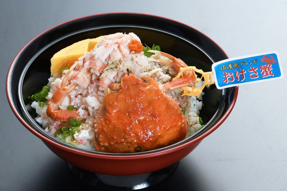 「おけさ蟹丼」は佐渡のブランドずわい蟹「おけさ蟹」がふんだんに盛られた一杯。磯の香りとカニの旨味を味わえるメニューです。お店で使うお米には新潟県産のコシヒカリを使用。新潟の名物を一度に楽しめますよ。