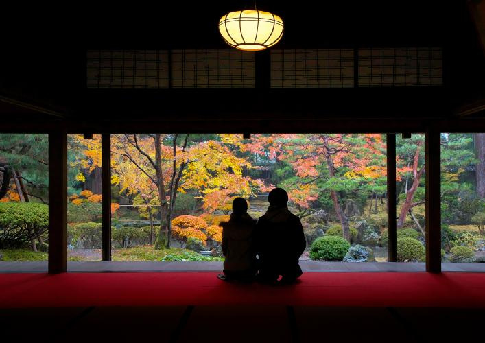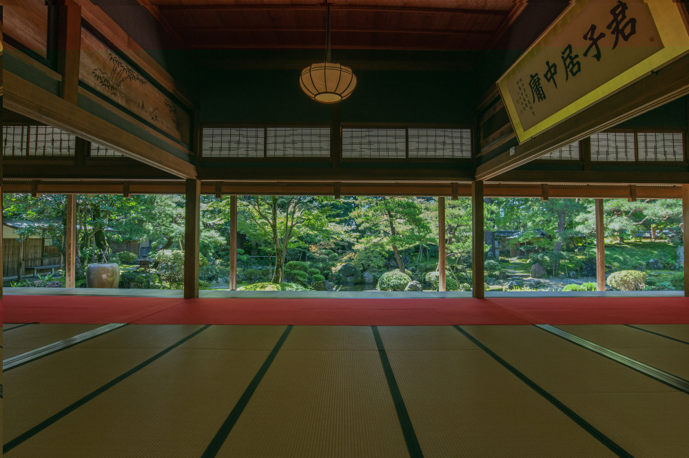 このスポットの一番の魅力は、屋根のある畳のお部屋から、座ったままお庭をのんびり眺められること。雨に濡れると、木々の緑や苔がいつもよりキラキラと輝いて目に映えます。
