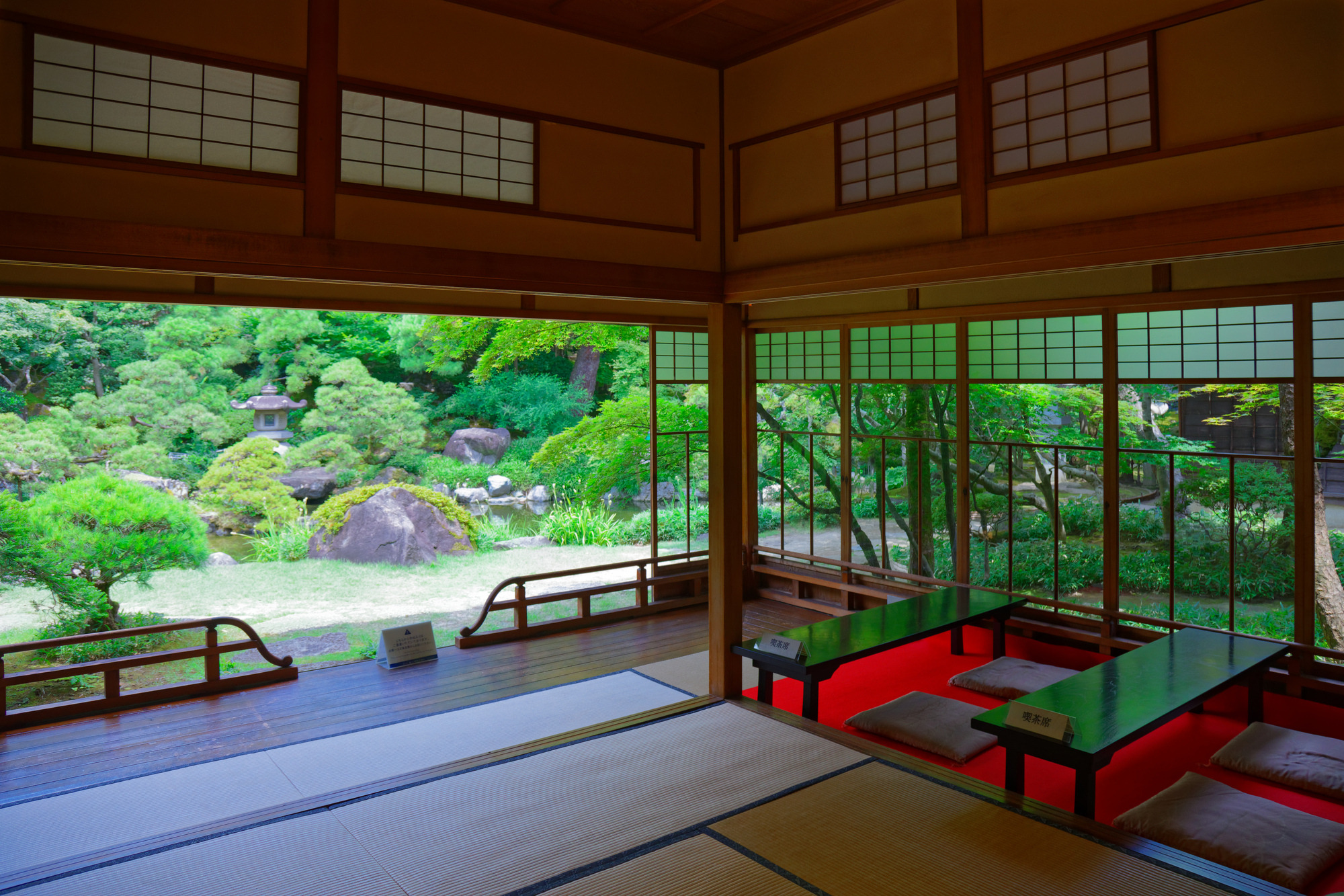 100畳敷の大広間から眺める回遊式庭園は、雨の日こそ庭の緑たちがしっとりと映えて幻想的な世界に。柱のない大空間で、雨垂れの音を聞きながらぼーっと庭を眺める時間は、まさに「和の癒やし」です。美術品コレクションも充実しており、天候を気にせずじっくりと文化に浸ってみてはいかがでしょうか。