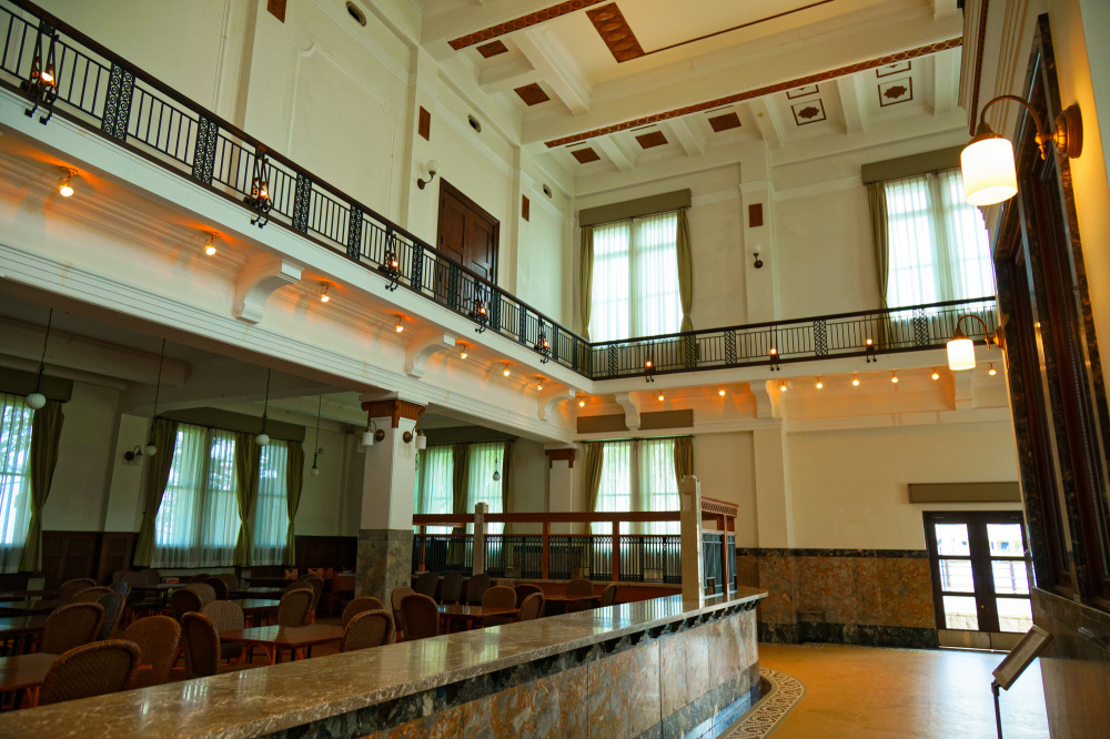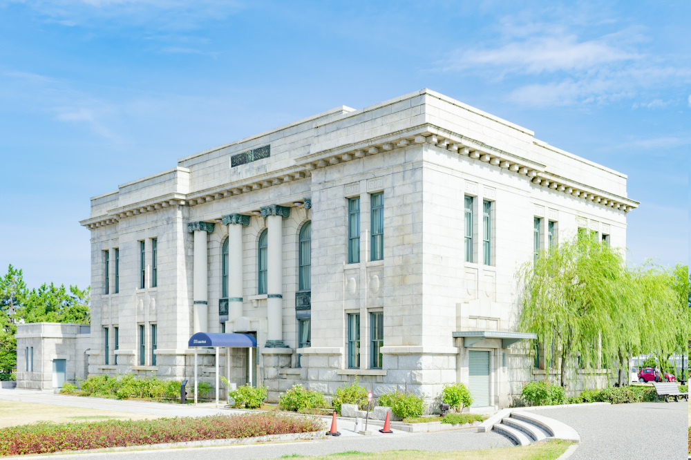 また、同じ敷地内にある旧第四銀行住吉町支店(国重要文化財)は必見。一歩中に入れば、豪華な吹き抜けの大ホールや重厚な大理石のカウンターが広がり、まるで映画のワンシーンのような世界が広がります。雨に濡れる石造りの外観も美しく、どこを切り取っても絵になる、大人の雨宿りにぴったりなスポットです。
