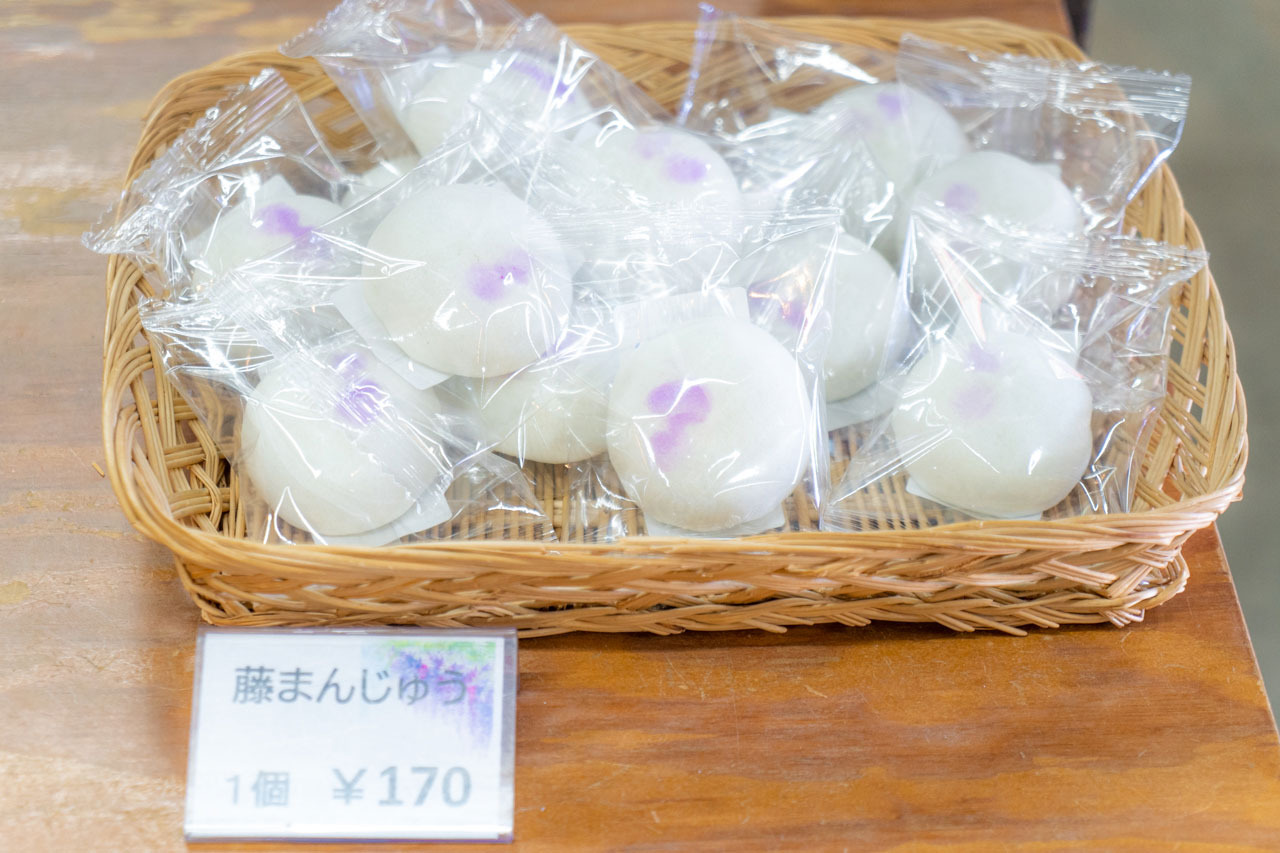 老舗菓子店が作る「藤まんじゅう(170円)」は、花びらをイメージした柔らかな皮で紫芋あんを包んだ饅頭。飛ぶように売れていく人気の一品です。