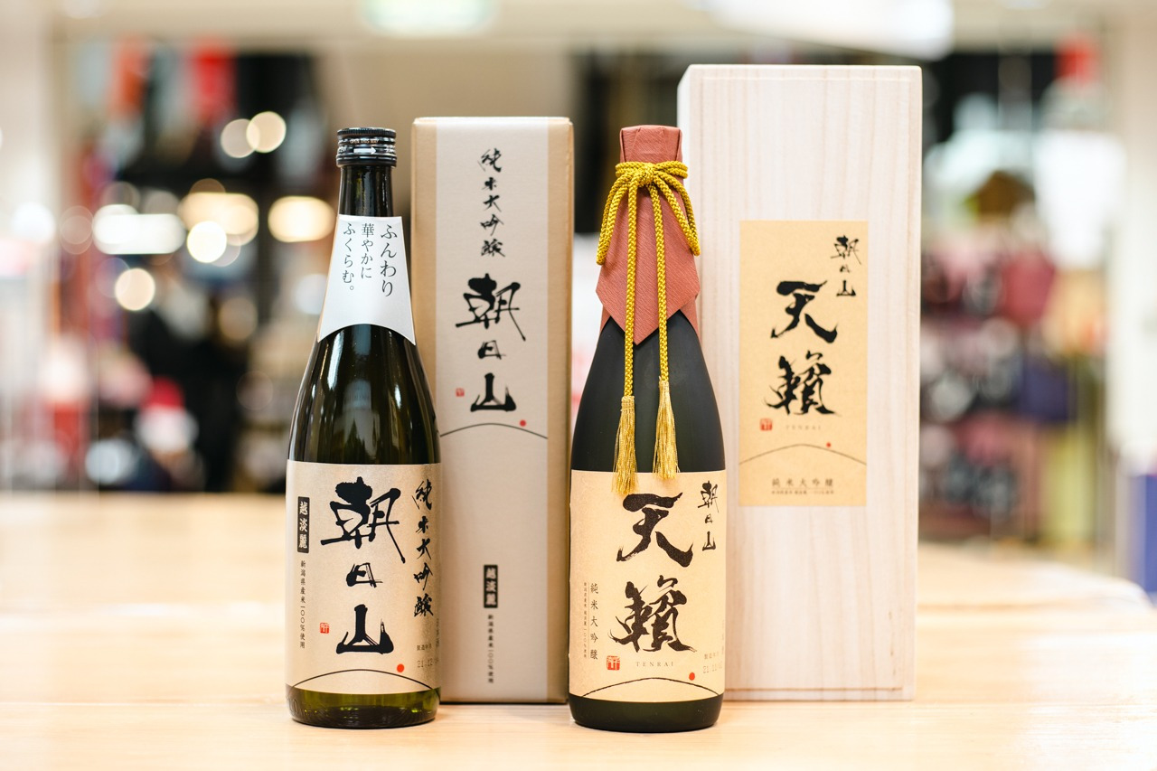 中でも朝日酒造の「純米大吟醸 朝日山(左)」は豊潤なうまみと華やかな香り、すっきりとした味わいで親しまれています。期間限定醸造の「純米大吟醸 天籟(右)」などの貴重なお酒も購入することができますよ!