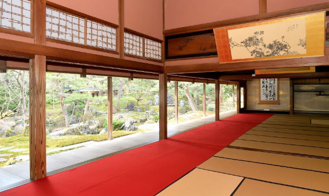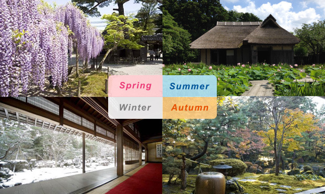 Enjoy the scenes of nature in four seasons; the cherry blossoms in spring, the ancient lotus in early summer, the tinted leaves in autumn, and the snow scape in winter.
