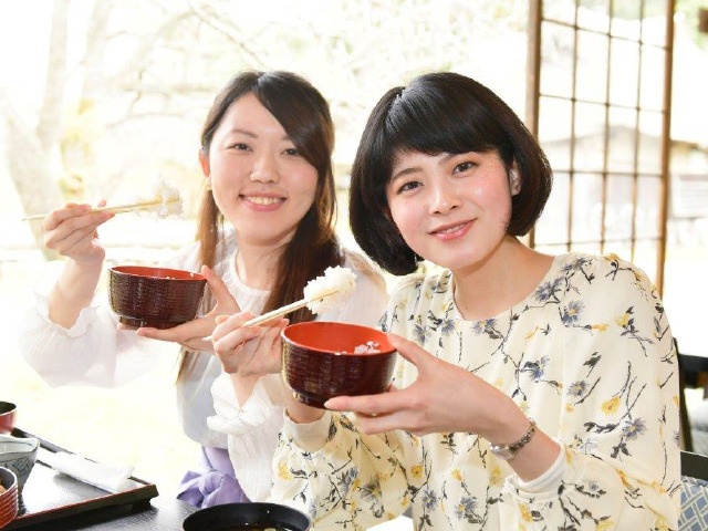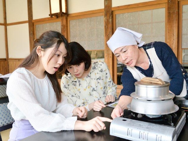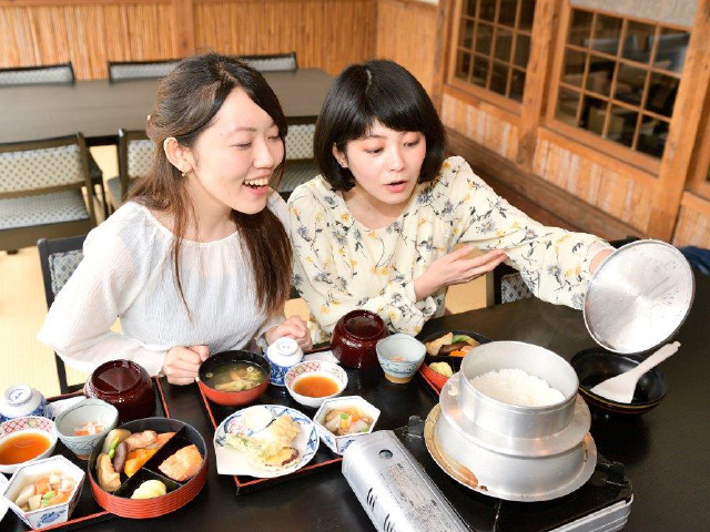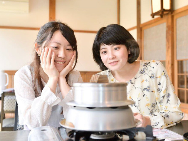 Hagama is set on a stove, fire is lit, and heat is adjusted as advised by staff. Enjoy the sound and aroma of rice cooking while you wait. Then, taste the delicious just-cooked Koshihikari rice.