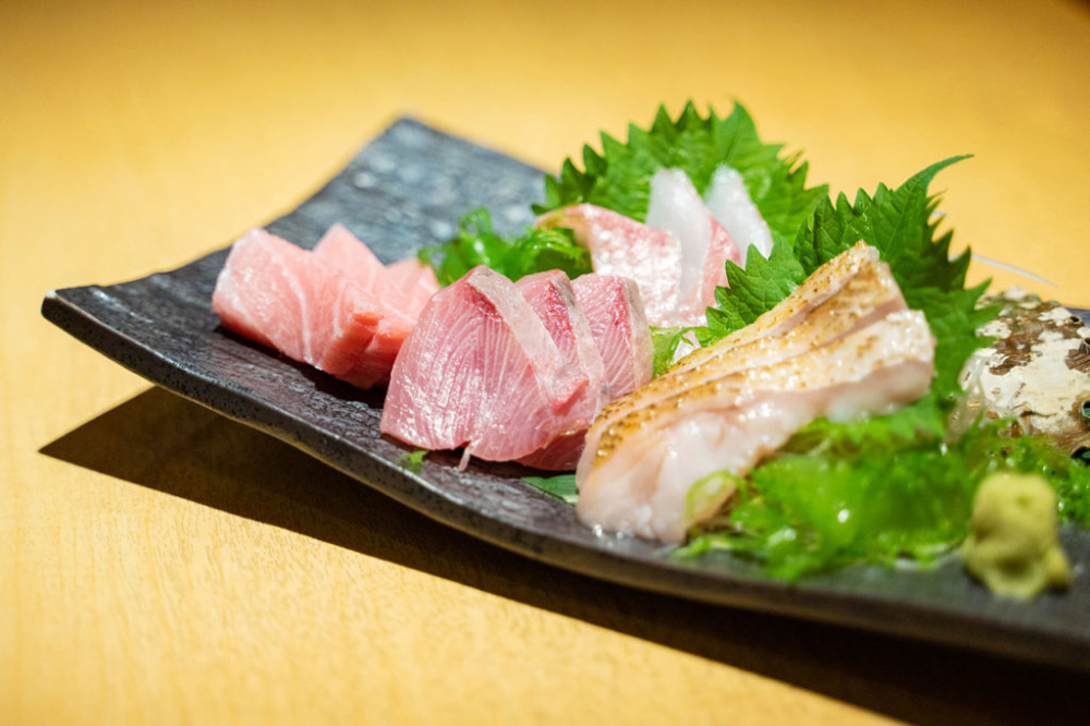 板場に立つのは、板前一筋30年、魚を知り尽くした親方の品田さん。カウンター越しに話が弾む中、まずは刺身の盛り合わせをおすすめしてくれました。