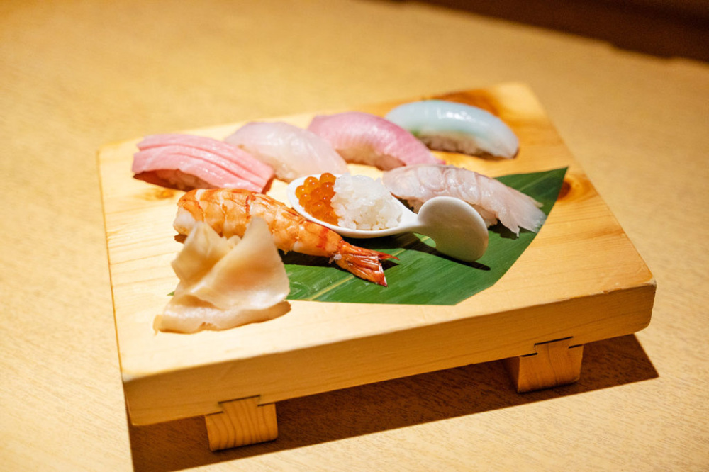 県内外の旬のネタを使っていて、この日は、きじはた、のどぐろ、あおりいか、蒸しエビ、ブリ、トロなど。シャリには新潟産の米を使用していますが、コシヒカリだけだと粘りの強いためこしいぶきなどをブレンド。時期によって配合も変化します。