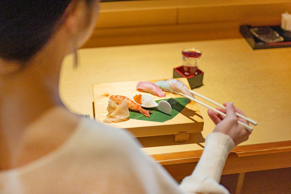 白身魚、貝などは淡白な味わいを活かすために塩で、マグロ、ブリといった味の強いネタは旨味を引き立てるために醤油をつけて。シャリに使われてる、親方秘伝のすし酢が風味を引き立てます。軽い握りで、お酒を飲んだ後の締めやつまみにもオススメですよ!