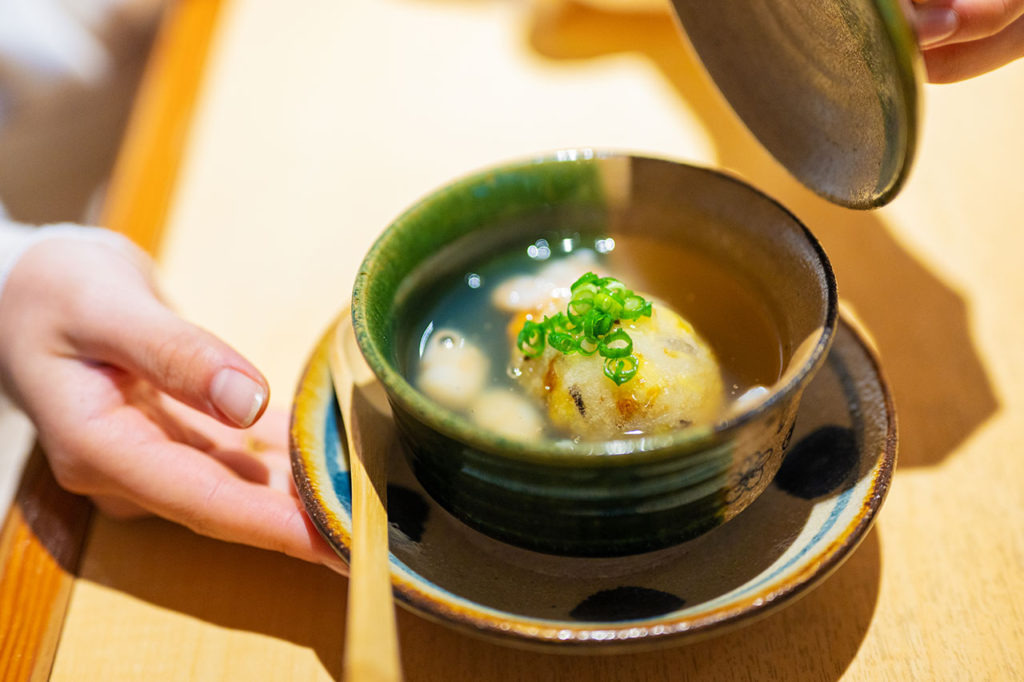 最後に注文したのは、一家創業当初から人気の名物「れんこん饅頭エビあんかけ」。親方の故郷五泉市の大口れんこんを使った、なめらかな食感のしんじょうとエビの上には、一番出汁の効いた吉野葛のあんがたっぷりとかけられています。練り込まれたきくらげがアクセント。