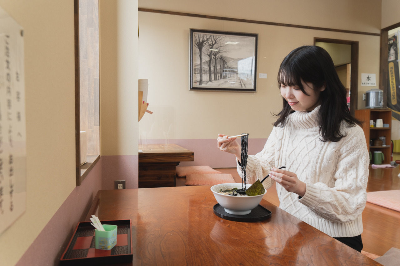 小腹が空いたら食堂へ!うどんや丼、西蒲区産の米「新之助」を使ったおにぎりセットなど豊富なメニュー中から市野瀬さんが注文したのは、常連客の声から誕生したユニークなメニュー「黒いラーメン(750円)」。