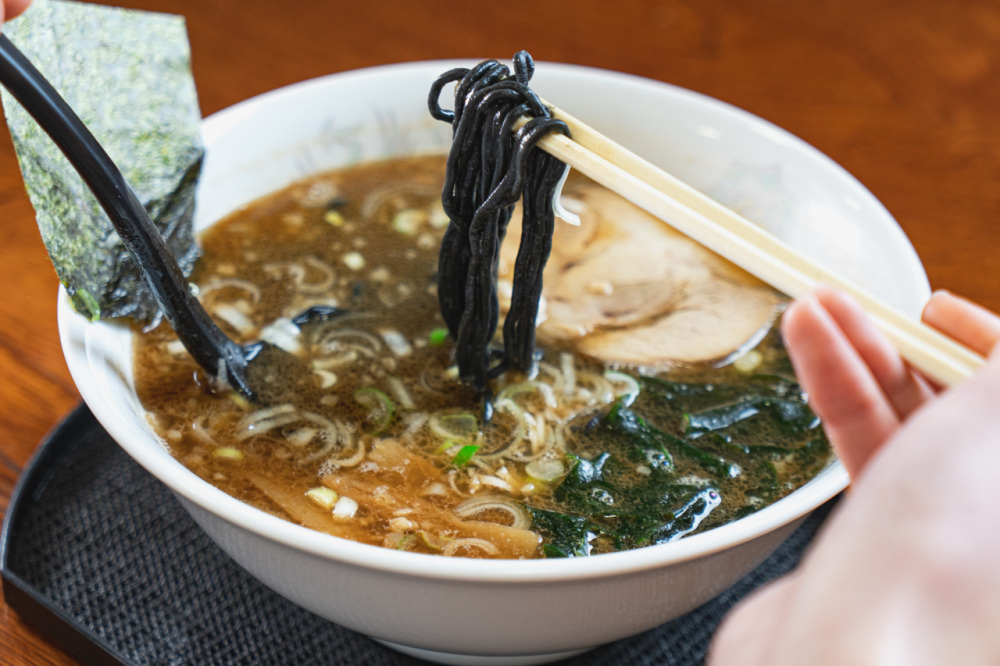 その見た目から黒湯を連想させますが、実は10年前からある商品なんだそう。麺に使われている竹炭にはデトックス効果が期待できるため、見た目に反して体に優しい一杯です。新潟県産の豚肉と秘伝のタレを使用したチャーシューなどトッピングも絶品ですよ!