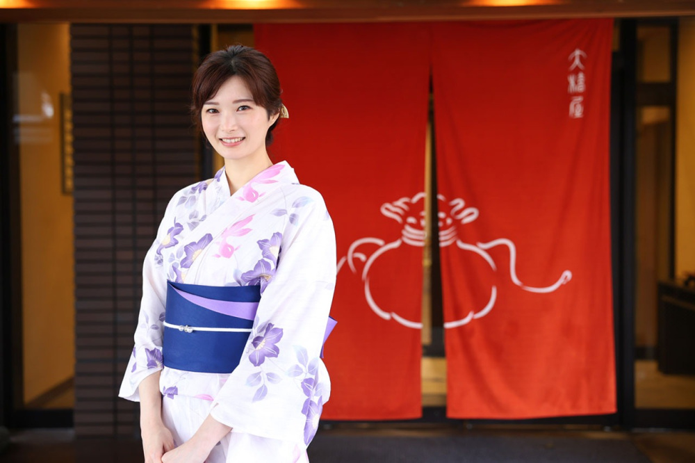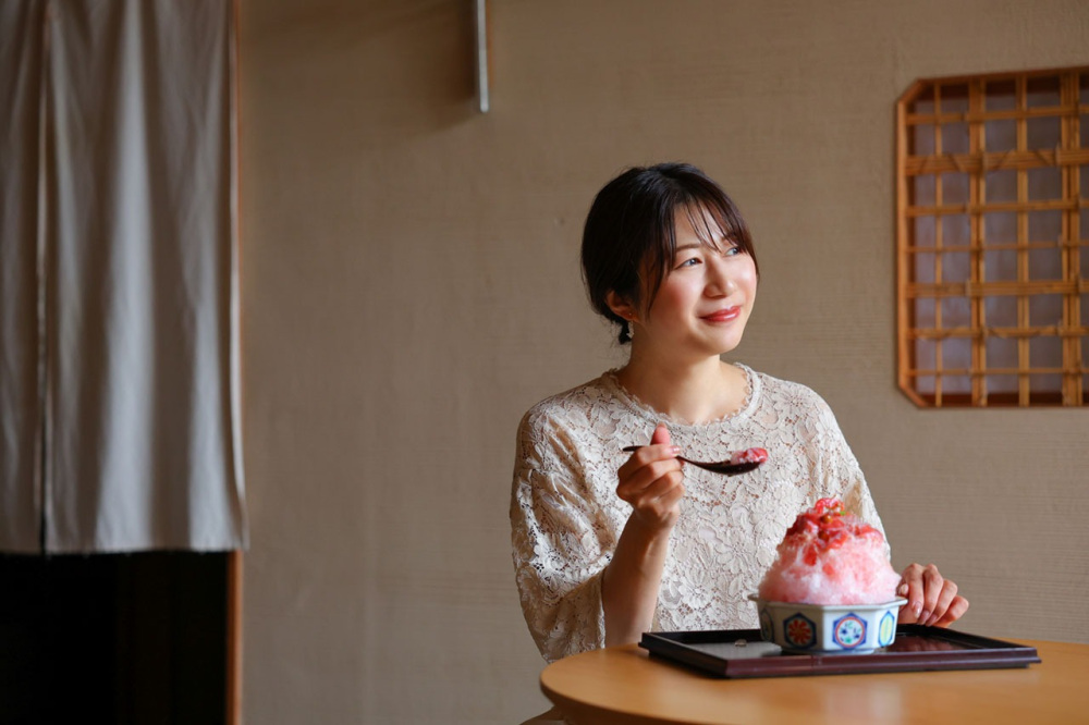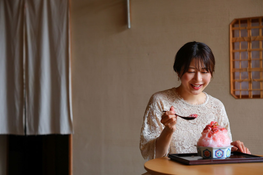 この日、涼やかな浴衣姿で迎えていただいたのは若女将の大橋さん。夏季になると登場するかき氷は、2021年からスタートしたメニューで、今では大橋屋の夏の風物詩に。専属のパティシエが手がけるシロップやトッピングがおいしさの秘密です。メニューは大橋さんとスタッフで考案。毎年進化するんだそう。
