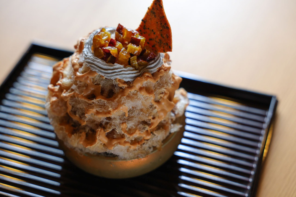 珈琲キャラメル(1,300円)はコーヒーゼリーを食べているかのような風味と甘味を楽しめます。香り豊かなコーヒーシロップの上には、大学芋、クッキー、胡麻クリームがトッピング。食べ進めるとキャラメルアイスがでてきて、味の変化を楽しめるのが特徴です。