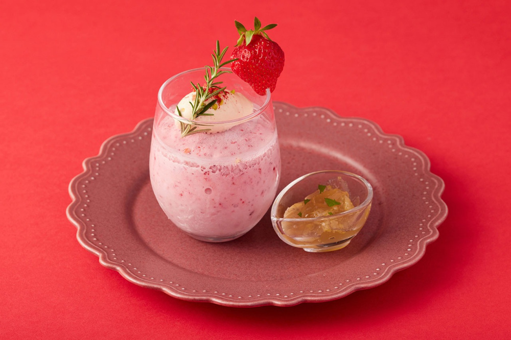 ベリーとヤスダヨーグルトのグラニータ(1,100円)は、3種のベリーと爽やかなヤスダヨーグルトを贅沢に使用。シャリシャリとした食感と、ベリーの甘酸っぱさがたまりません。ハーブ香るレモンのジュレを加えると、さらに爽やかな味わいに変化。