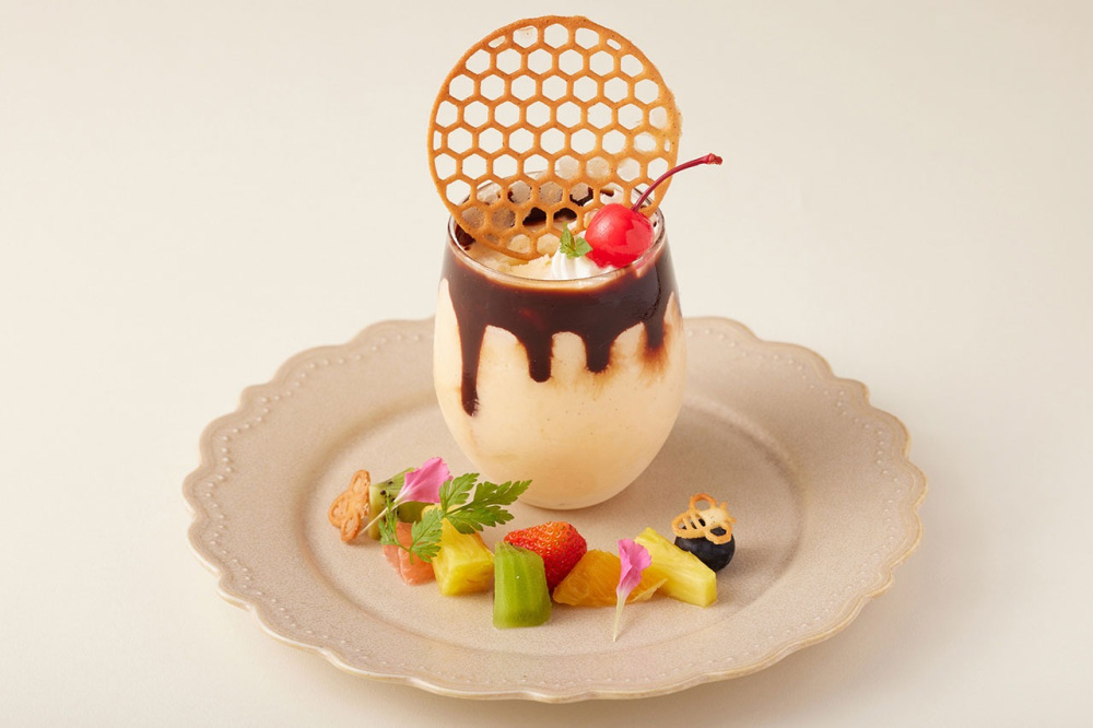 はちみつプリンのグラニータ(1,200円)は、蜂蜜プリンをグラニータに仕立て、チョコレートソースでかわいらしくデコレーション。フルーツの彩りとフレッシュな味わいがアクセントになっています。濃厚なプリンの甘さと、シャリシャリした食感の絶妙なバランスが新しいかき氷です。