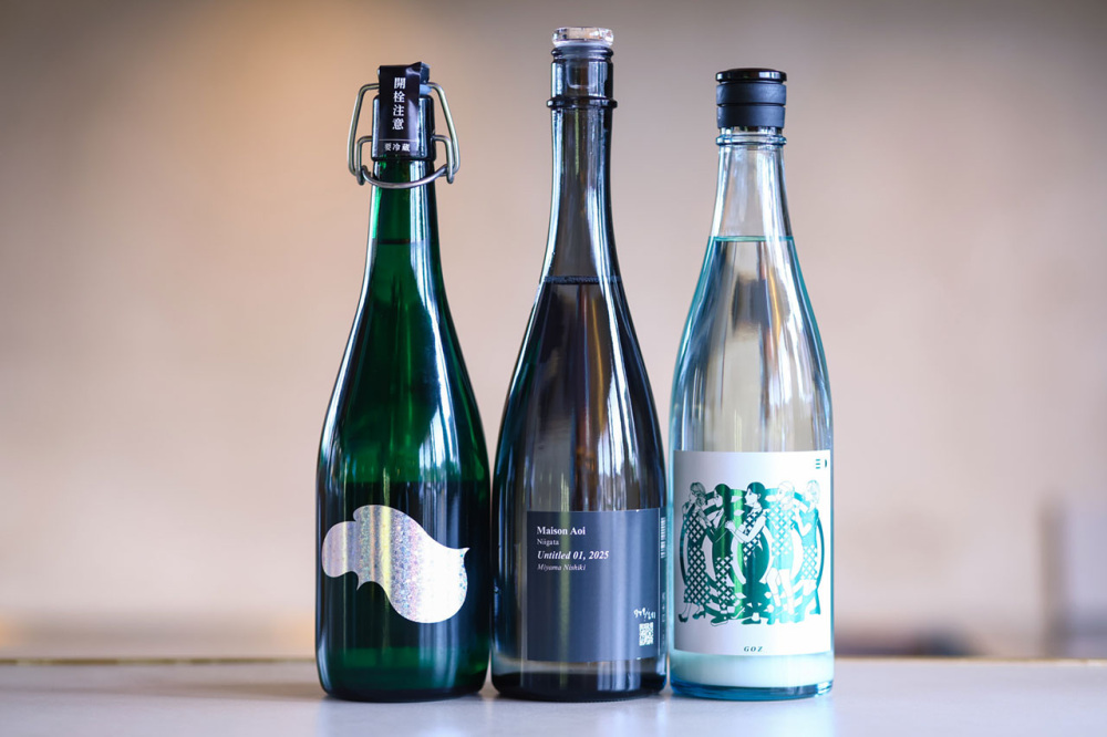 メゾンアオイ(写真中央)は、2024年に長岡市にある高橋酒造を引き継いだ葵酒造が手掛ける話題の日本酒。飲む人の感性に委ねるという想いから、アート作品に使われる「Untitled」が商品名につけられたそう。