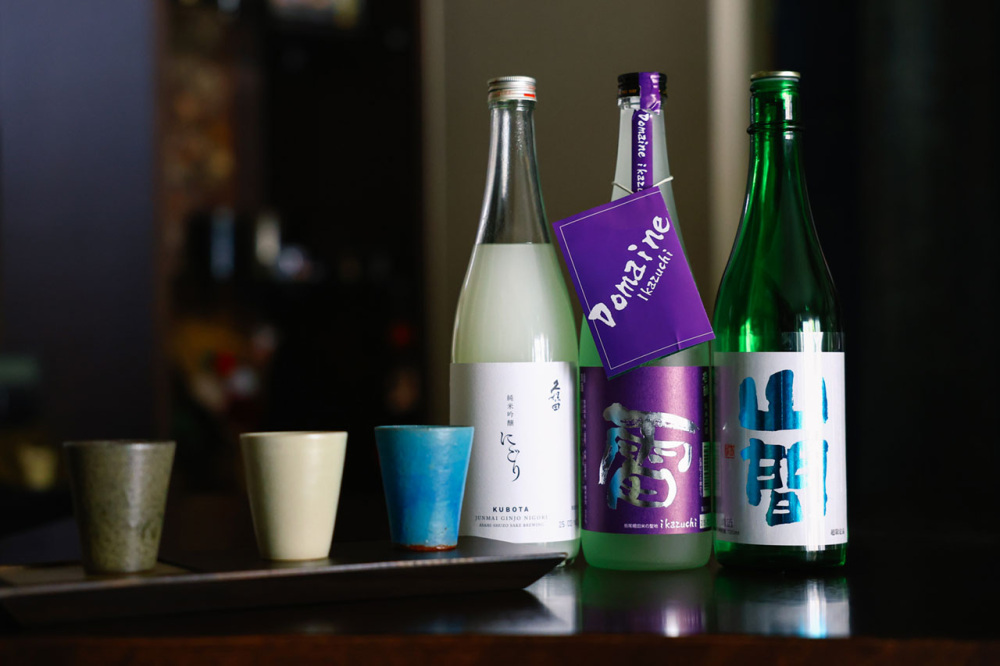 カウンターでは角打ちを楽しめます。メニューには日本酒、ワイン、ビールなど、毎日変わるおすすめ商品が揃っています。この日は日本酒、ワイン、ミードから3種類を選べるセットをセレクト。新潟で作られた日本酒をいただきます。