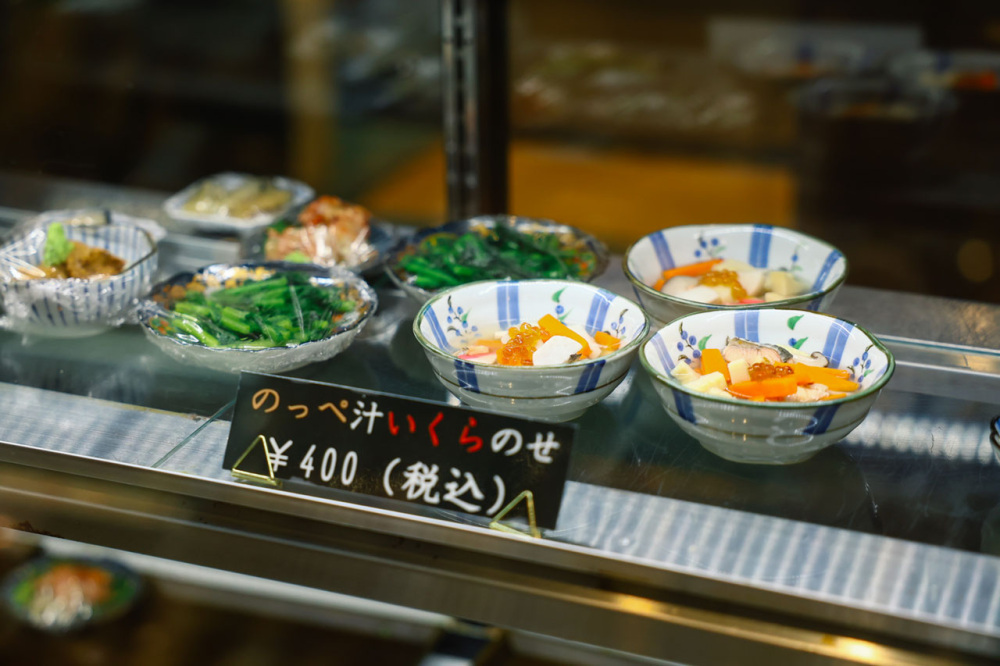 お店では日本酒に合う、あん肝、ぬか漬けなどの手作りのおつまみを注文できます。その他にも、のっぺ汁などの郷土料理や、新潟県産のコシヒカリを使った海鮮丼や定食もあるので、地酒と合わせるなんて楽しみ方もおすすめです。